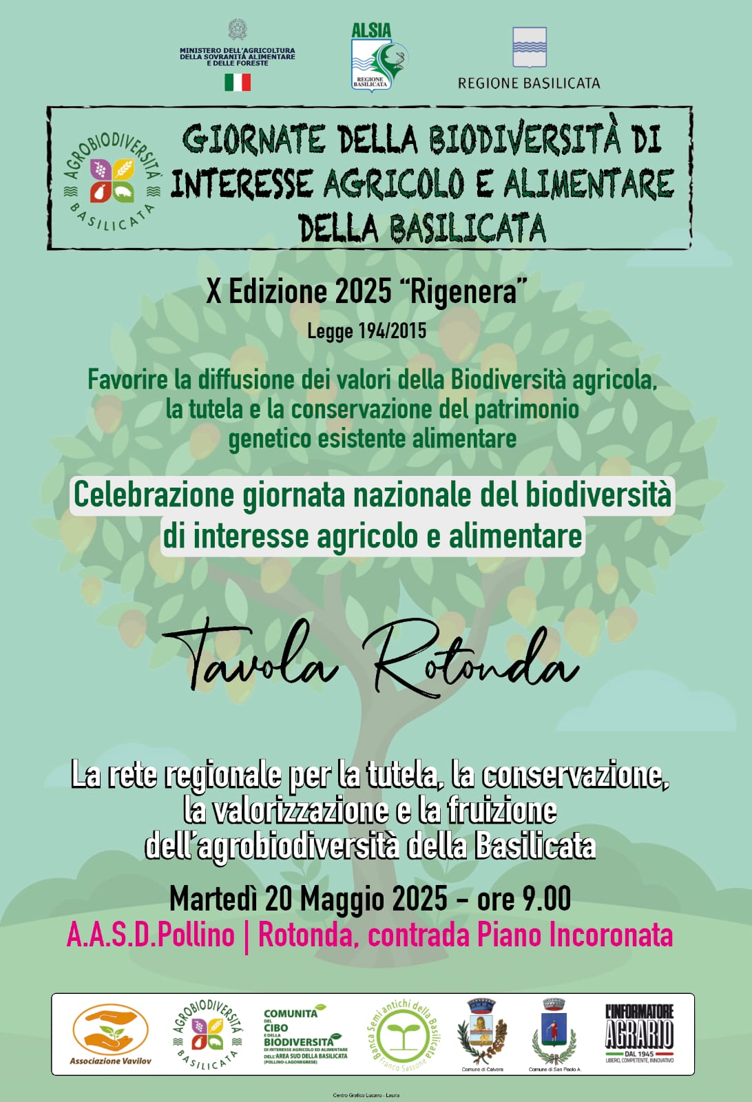 Martedì 20 maggio si terrà una tavola rotonda “La rete regionale per la tutela, la conservazione e la conservazione del patrimonio genetico agricolo e alimentare” in collaborazione con la Comunità del Cibo Pollino/Lagonegrese, Associazioni, consorzi, ecc. presso ALSIA AASD (Azienda Agricola Sperimentale Dimostrativa) “Pollino” a Rotonda (PZ).