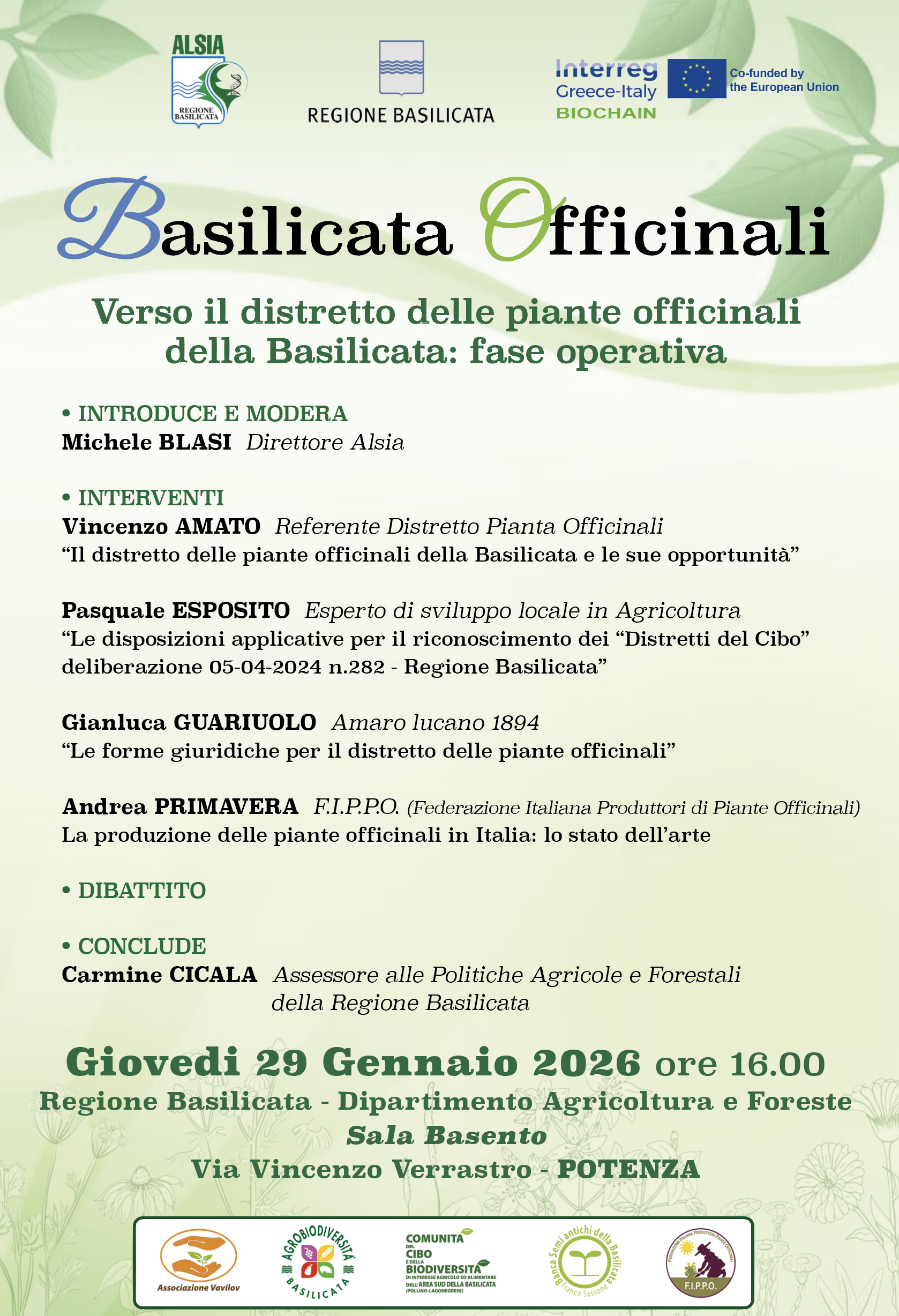 Giovedì 29 gennaio si terrà un secondo incontro dal titolo "Il distretto delle piante officinali della Basilicata: fase operativa" presso la sala Basento del Dipartimento Agricoltura e Foreste, Regione Basilicata.